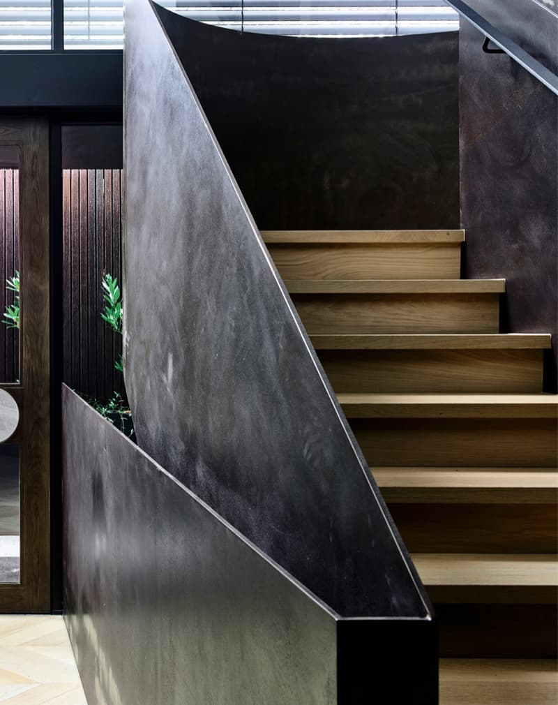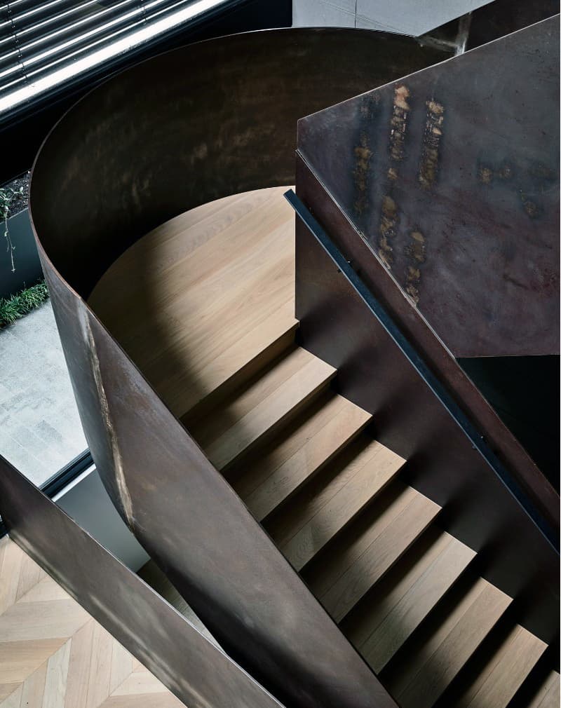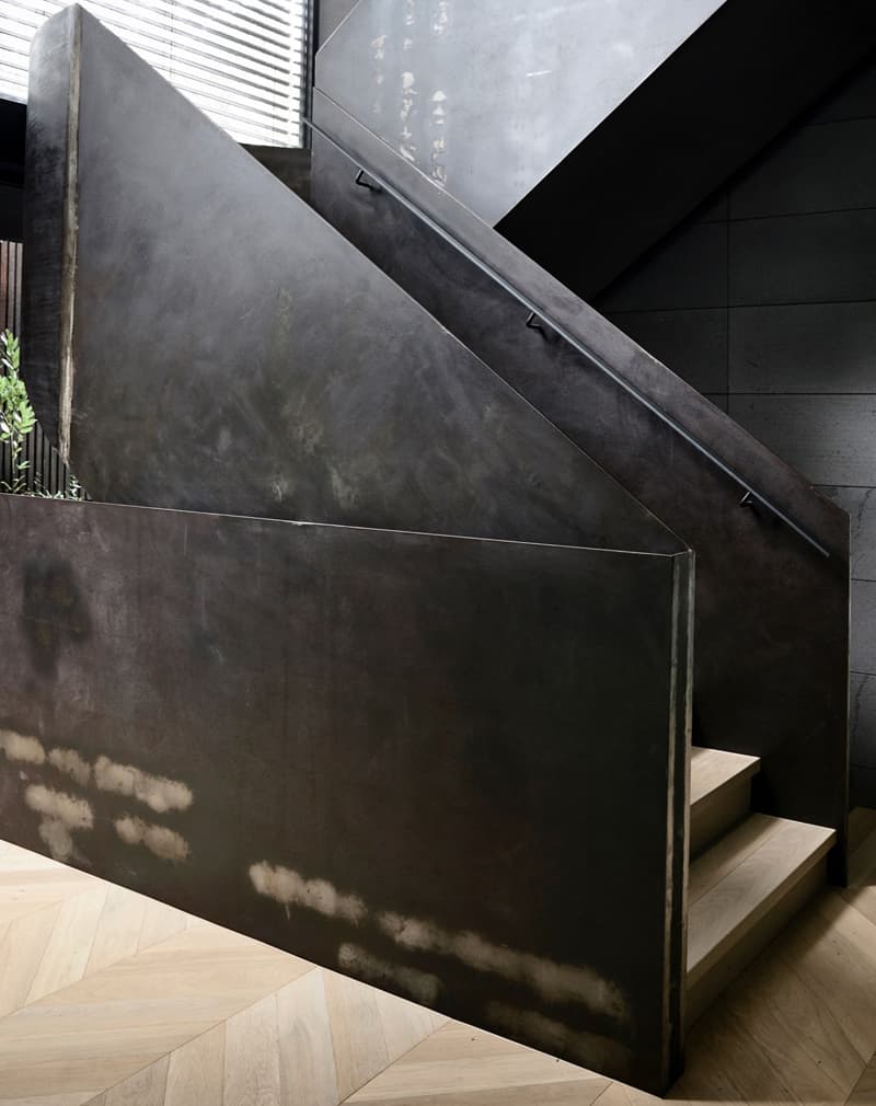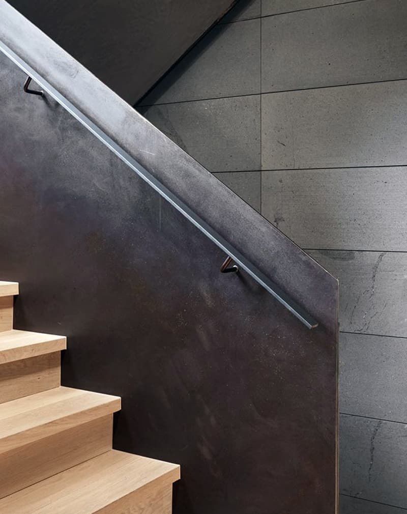 Перила сделаны из металлического листа 8мм. Применено легкое ржавление и чернение металла. Покрытие лак бесцветный. Поручень металлический профиль 40х20мм на Г-образных держателях. Подойдут к хай-тек и лофт интерьерам.