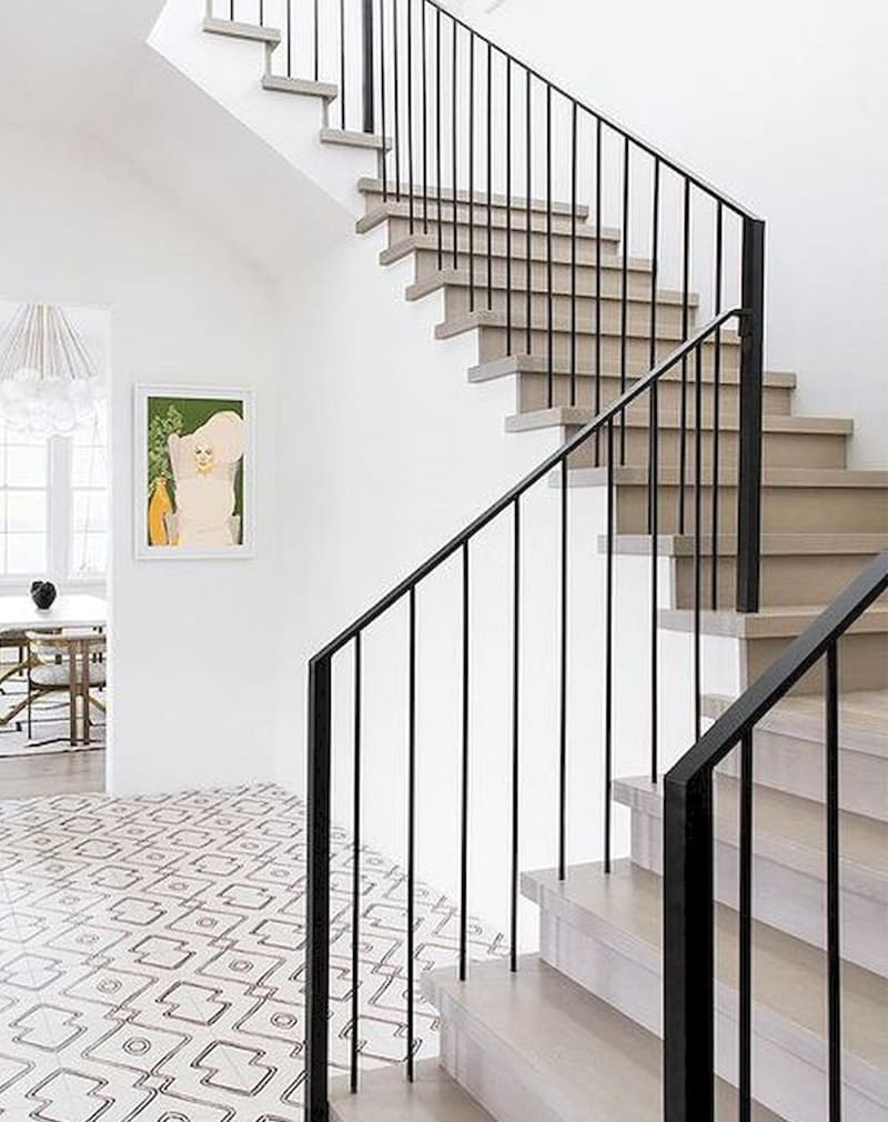 Такие перила подходят практически под любой стиль интерьера. Есть два варианта изготовления и монтажа этих перил. Первый: изготавливаются из верхней полосы 40х8мм, катанки калиброванной 12мм, нижней полосы 100х8мм. Монтируются нижней полосой в пол или лестничное полотно. Второй: изготавливаются из верхней полосы 40х8мм и катанки калиброванной 12мм. Монтируются непосредственно в пол или лестничное полотно. Как ни странно, но второй вариант дороже, хотя меньше расход материала. Разница в цене обуславливается исключительно сложностью монтажа. Покраска перил порошковая. Цвет — на ваш выбор. Необходимо провести предварительный замер места установки и выяснить все детали. Только после этого устанавливается окончательная цена. Монтаж перил обычно занимает несколько часов. Лучше производить монтаж уже после чистовой отделки лестницы.