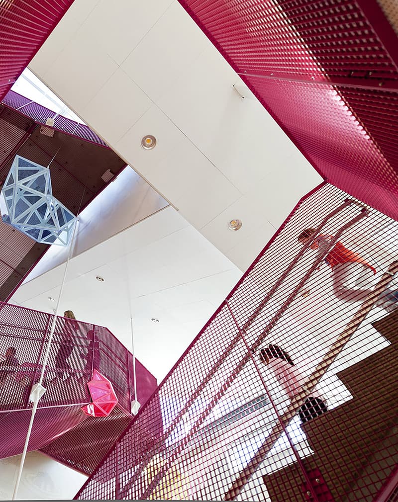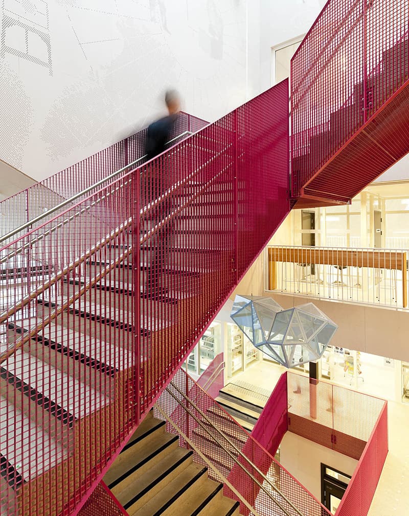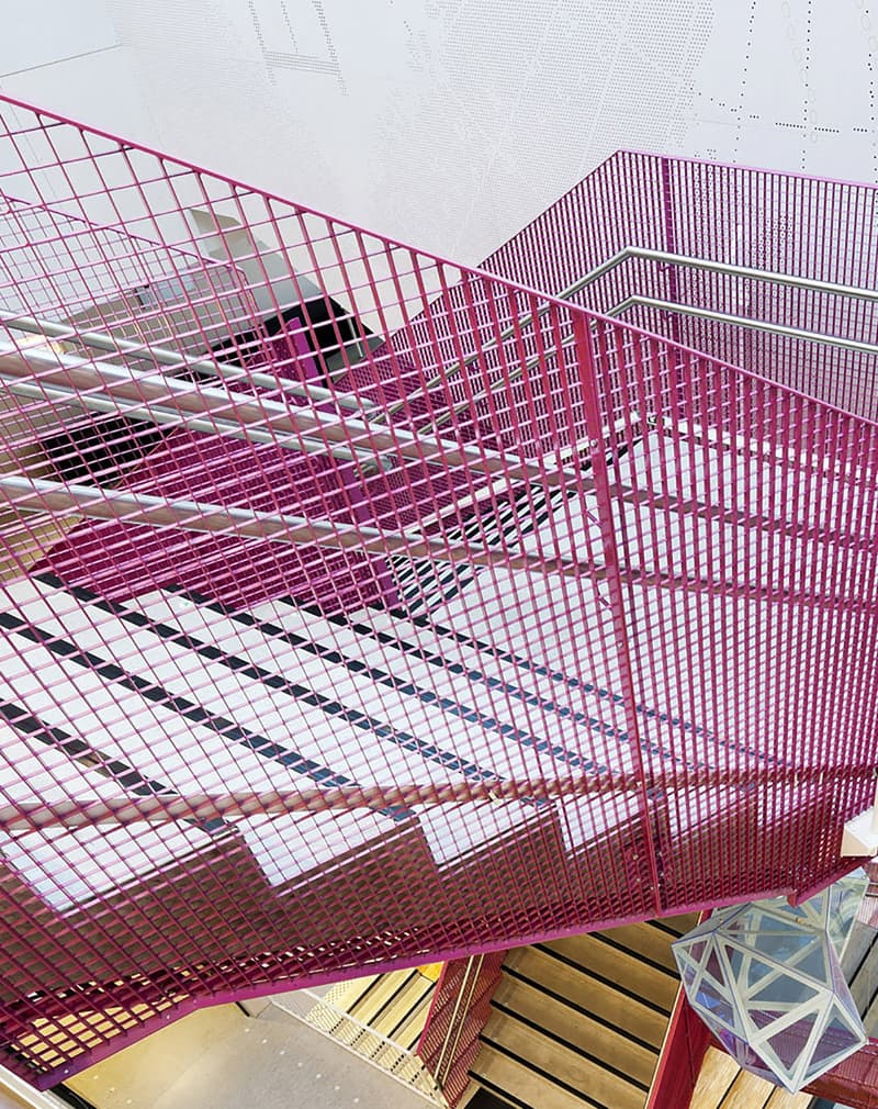 Высокие металлические ограждения с круглым нержавеющим поручнем с внутренней стороны перил. Решетчатый рисунок придает воздушность в сочетании с надежностью. Подходят для общественных пространств, лестничных маршей офисных зданий.
