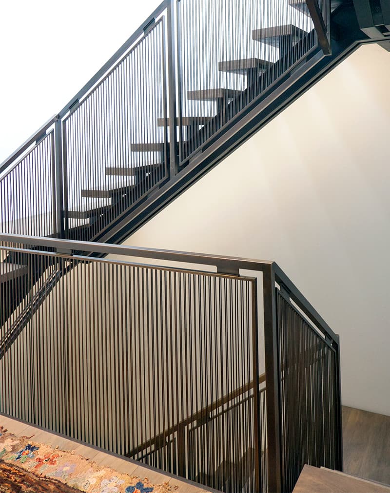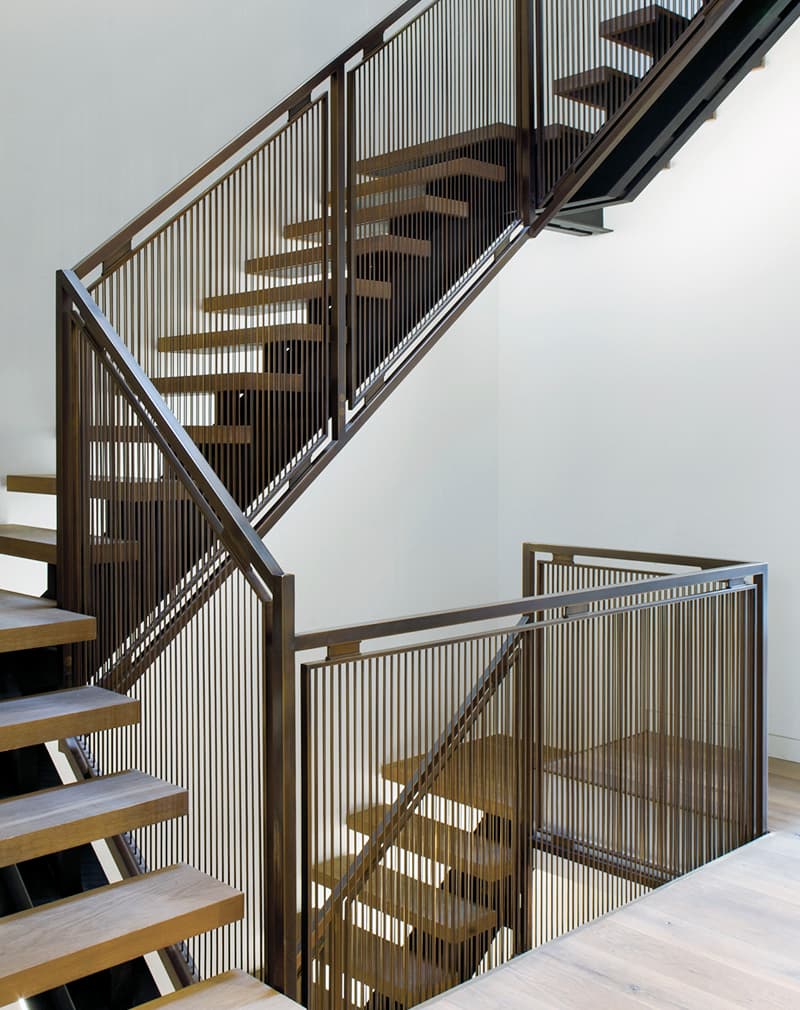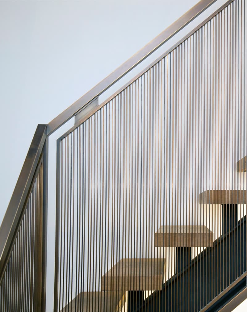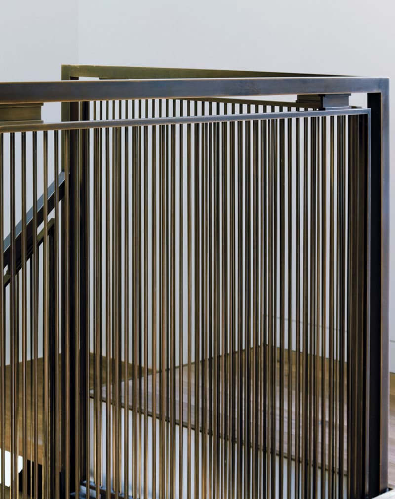 Стильные металлические перила с частым вертикальным рисунком из тонкого прута. Главным инструментом певца Орфея была арфа, на которую так похожи эти ограждения. Основной каркас из профиля металлического 50х50мм. Второй каркас профиль 30х15мм. Вертикальный рисунок из прута ⌀6мм. Крепление в торец лестницы. Высота над ступенью 1000мм. Покраска порошковая бронза металлик. Применено патинирование латунью.