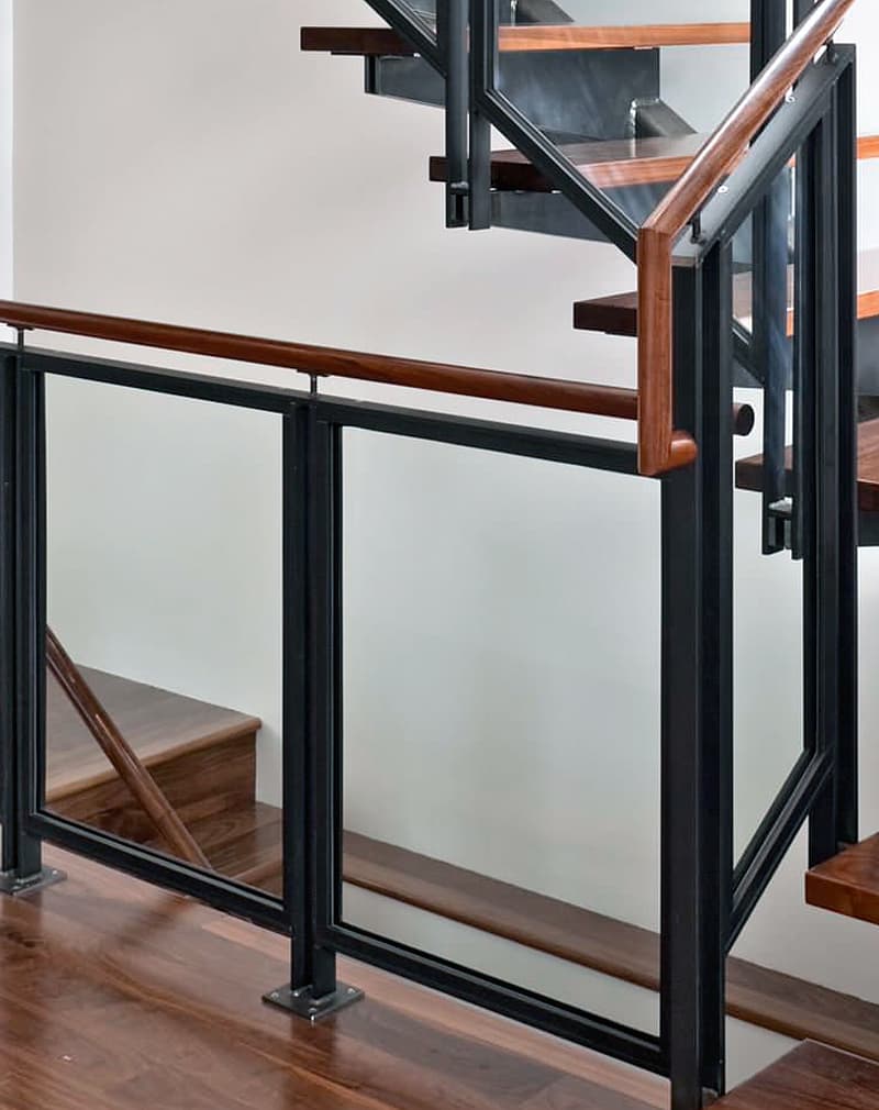 Перила со стеклом в классическом лофт-стиле. Основа металлическая полоса 50х10мм. Внутреннее наполнение закаленное стекло прозрачное 8мм. Надежно закреплено металлическим штапиком из профиля 20х20мм. Поручень круглый из дуба цельноламельного. Крепятся на внешнюю сторону лестницы. Покраска порошковая. Сделаны на основе перил «Прага Д».