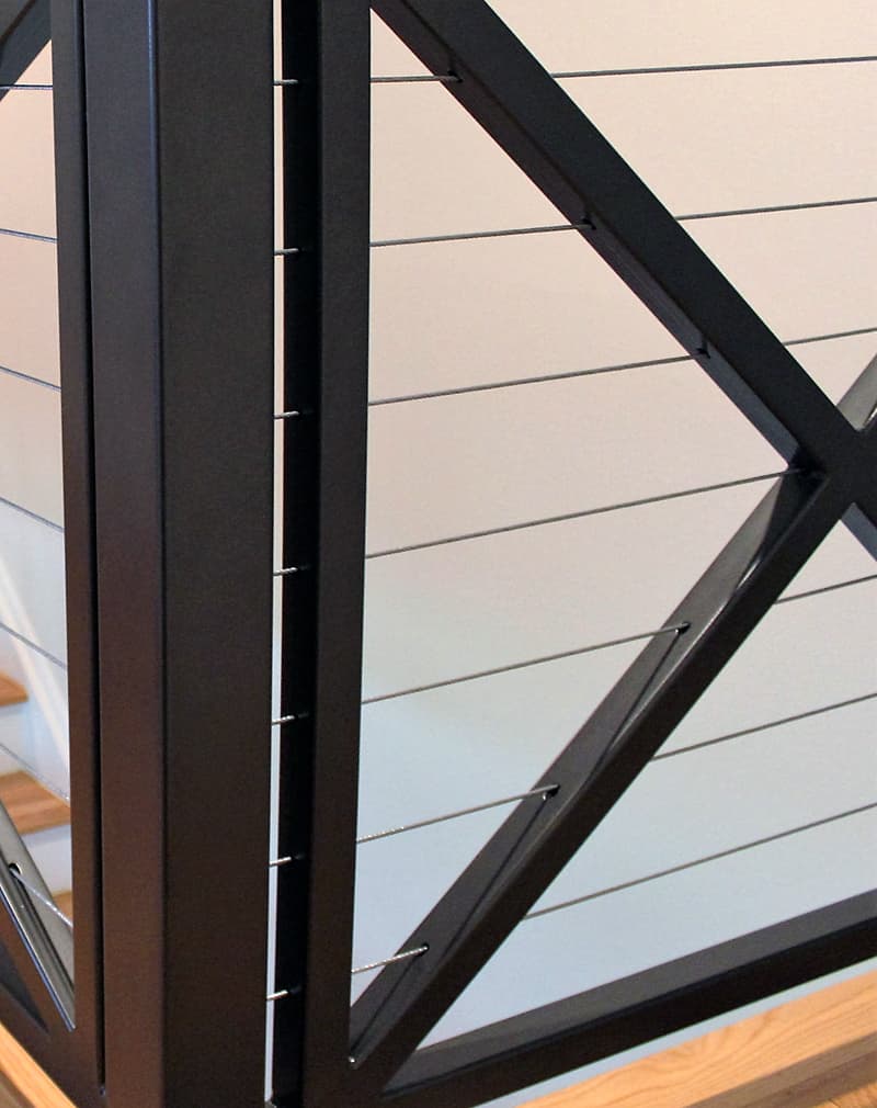 Перила лофт «Кабель Кросс» сделаны из металлического профиля 40х40мм. Внутреннее наполнение трос стальной в прозрачной обмотке. Поручни из металлического профиля 40х25мм. Такие перила подойдут к любому интерьеру. Покраска порошковая.