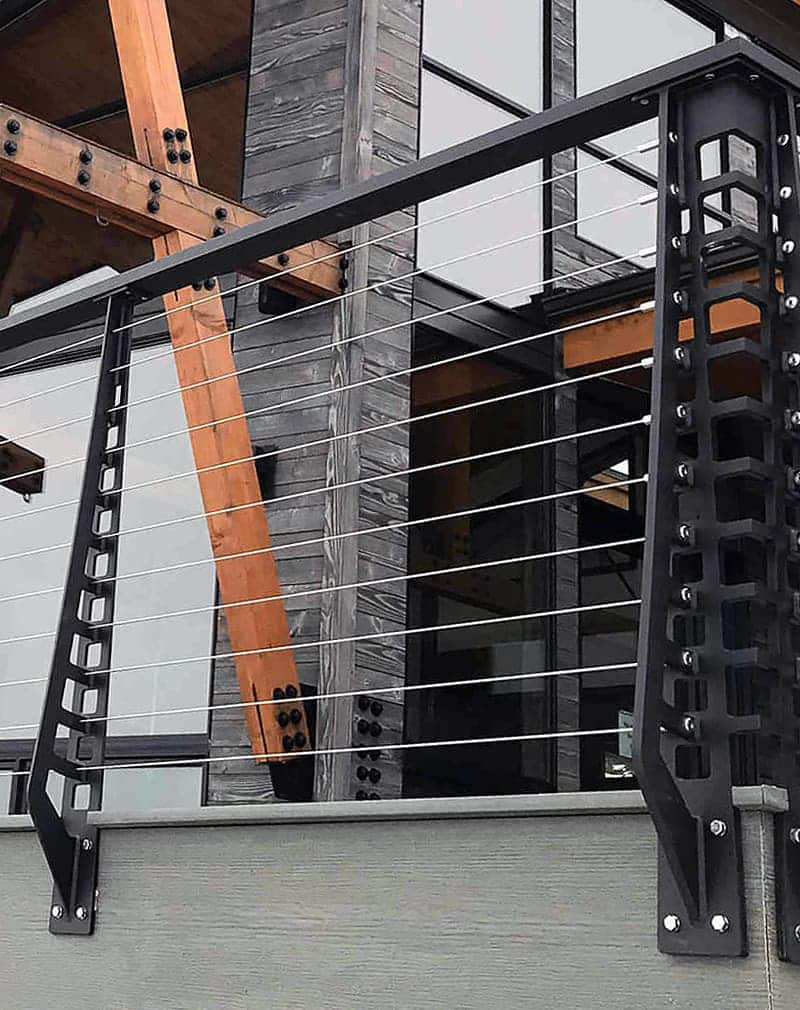 Перила лофт кабельные с дубовым поручнем. Стойки прямые фигурные. Сделаны лазерной резкой металла 8 мм. Внутреннее наполнение трос стальной в прозрачной обмотке.