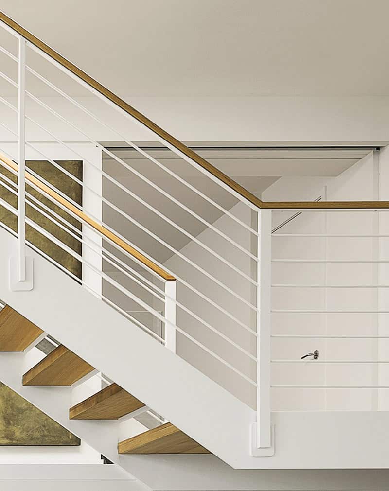 Простые и стильные перила в морском яхтенном стиле. Сделаны из профиля металлического и катанки калиброванной. Крепятся сбоку от лестницы. Поручень из массива дуба. Прекрасно подойдут к любым интерьерам — от классики до минимализма. Покраска порошковая.