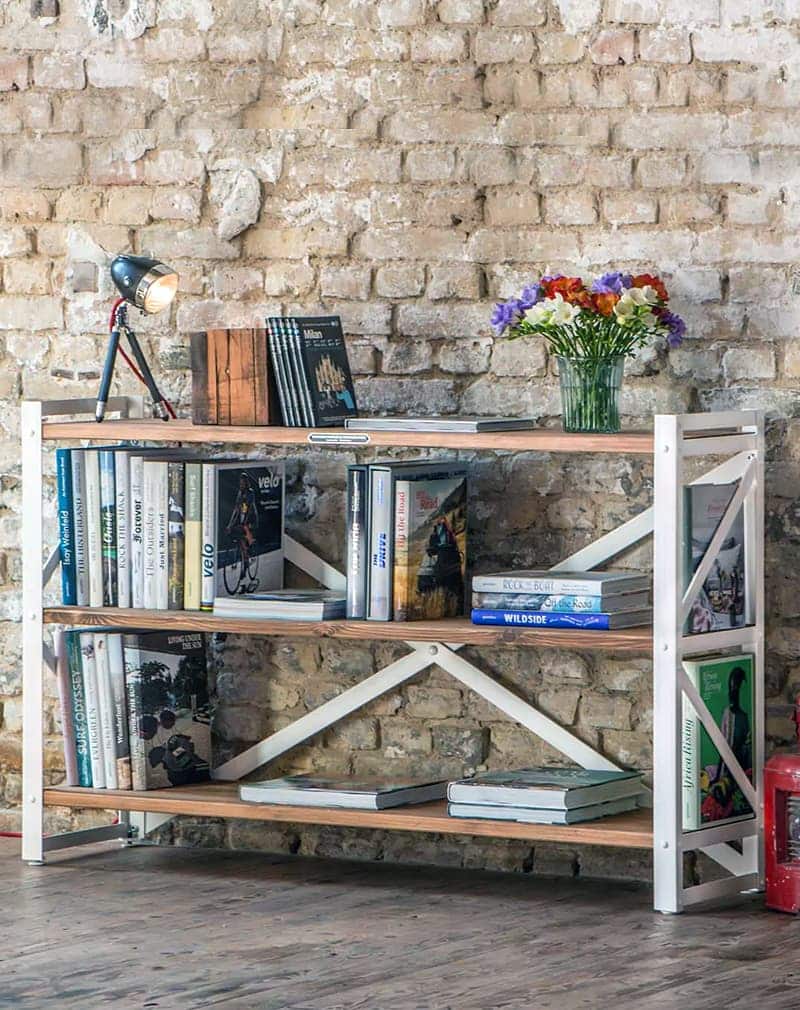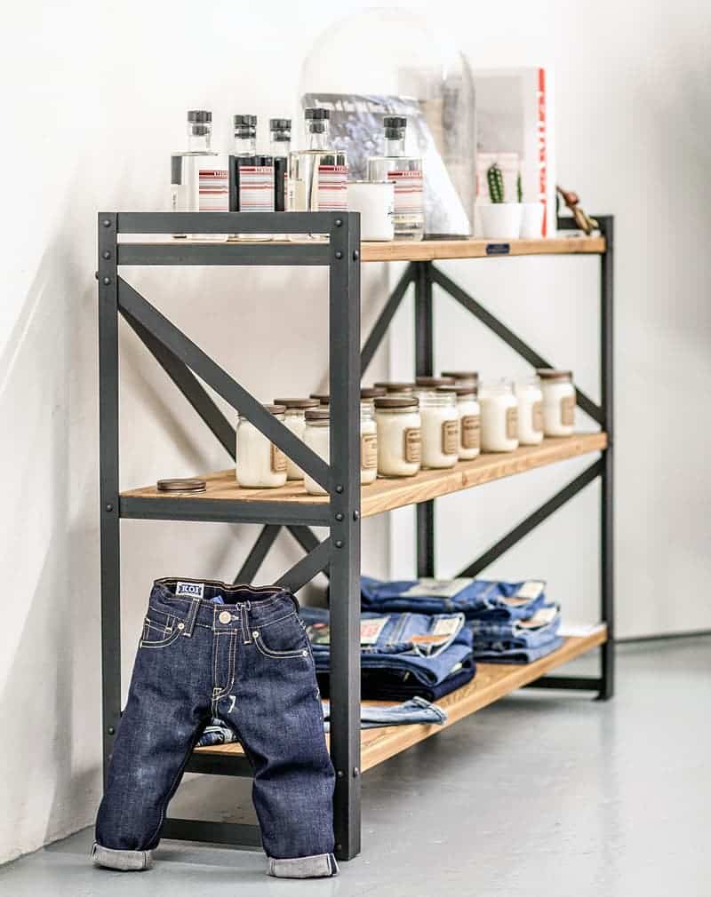 Стеллаж «Классик Мини 140» сделан из металлического уголка и полосы, проклепанных стильными мебельными болтами. Полки из мебельного соснового щита, покрытого маслом и воском. В отличии от многих мебельных фабрик, компания «La loft» предпочитает использовать натуральное дерево, а не ДСП или МДФ.